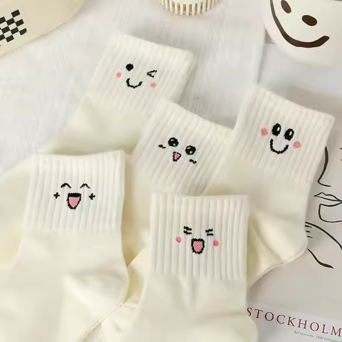 5 ペアかわいい笑顔プリント靴下秋の女性の暖かい靴下ミディアムチューブソックスカジュアル快適なスポーツソックス