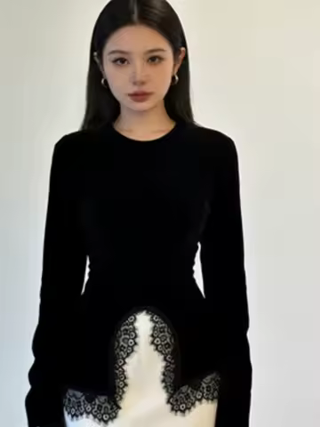 Women Black O-neck Lace Patchwork Back Lace Up Top Fashion Full Sleeve Solid Slim Irregular Tops Female Spring Chic Casual Wear
