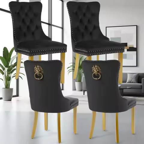 Set di 4 sedie da pranzo moderne capitonné in velluto con maniglie a testa di leone, gambe in legno dorato, sedie da cucina di lusso imbottite nere