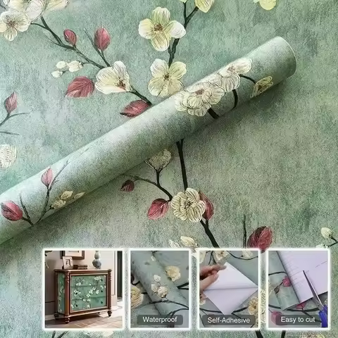 Floral Peel and Stick Wallpaper Green Flower Contact Paper Vinyl Self Adhesive Wall Paper Living Room Bedroom Cabinet Decoration