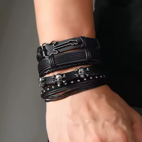 Erkekler için deri bilezik yeni moda aksesuarları erkekler DIY deri bilezik Set basit gitar ses kafatası kombinasyonu bilezik