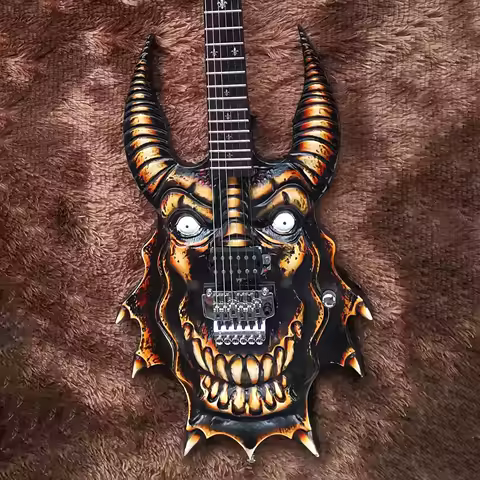 El Oyması Elektro Gitar Kafatası Çift Boynuzlu İnek Kafası Tasarımı, Humbucker Manyetikleriyle – Stüdyo, Sahne veya Cadılar Bayramı için İdeal