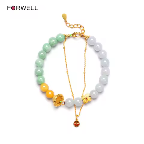 FORWELL Damska Bransoletka z Naturalnego Jadeitu Posrebrzana 18K Złotem Żółty Jadeit Modna Biżuteria na Prezent dla Dziewczyn