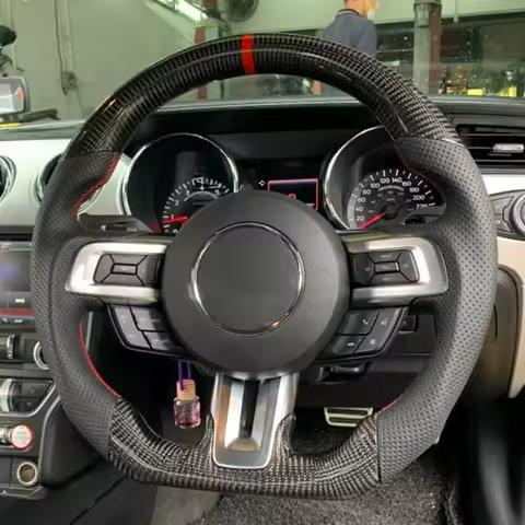 Volante de fibra de carbono Real de cuero perforado rojo apto para Ford Mustang GT EcoBoost Shelby 2015-2023 volante de carreras deportivo